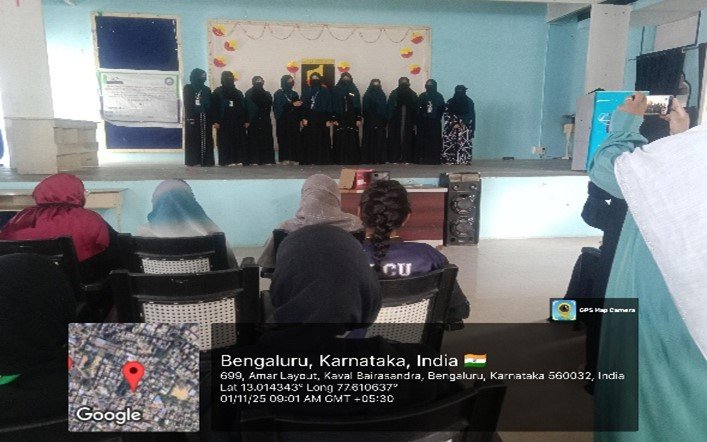 A Kannada speech on the significance of Kannada Rajyotsava was presented by Shafiqua, 3rd year BCom, emphasizing the cultural richness of Karnataka and the importance of preserving the language.