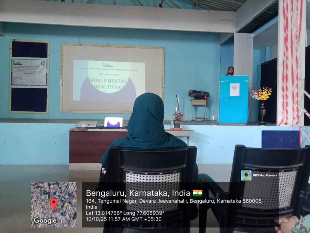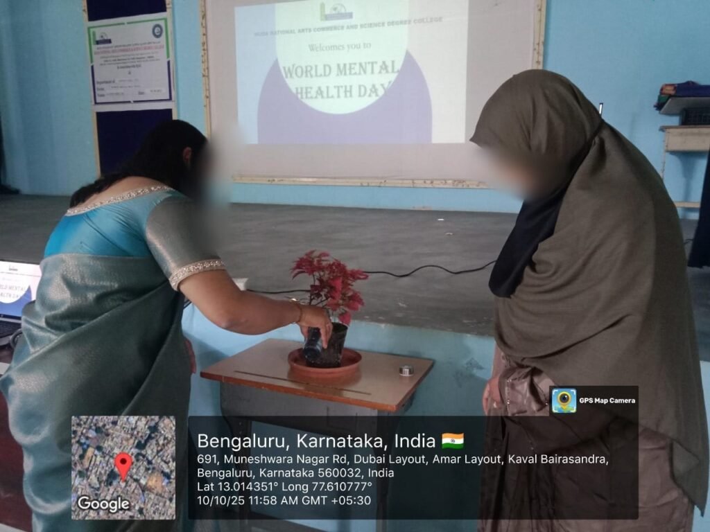 A warm welcome speech was delivered by Nadiya of 3rd Yr BSc, who introduced the purpose of the gathering and acknowledged the presence of the dignitaries. This was followed by the symbolic act of plant watering carried out by the guest and the Principal, highlighting growth and care as central themes of mental health.